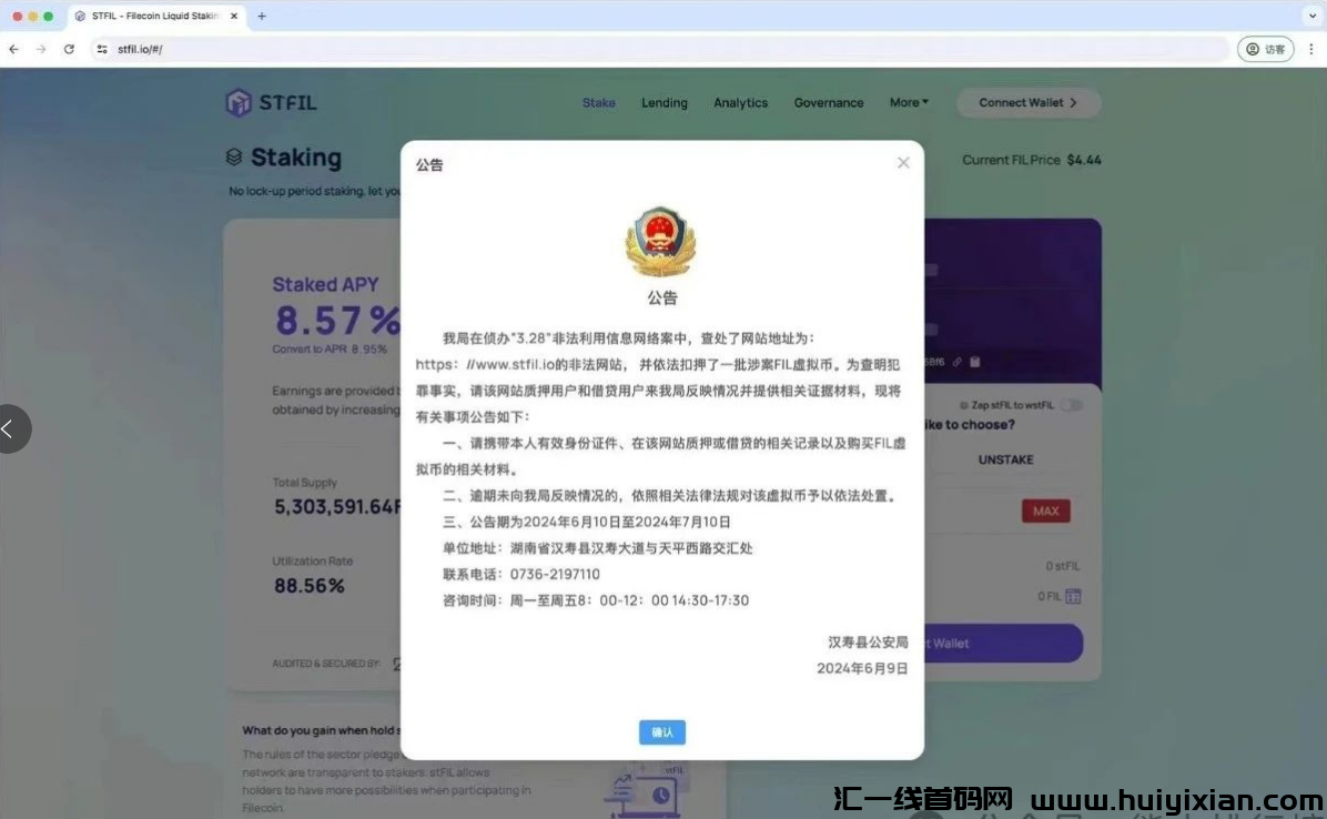 今日消息,湖南省汉寿县公安局发布公告称,在侦办“3.28”非法利用信息互联网案中,查处了非法网站 https://www.stfil.io,并扣押了一批涉案 FIL 虚拟b。请该网站质押和借贷用户携带有效身份证件、相关记录和购买 FIL 虚拟b的材料,于 2024 年 6 月 10 日至 7 月 10 日期间前来报案,逾期未报将依法处置虚拟b。